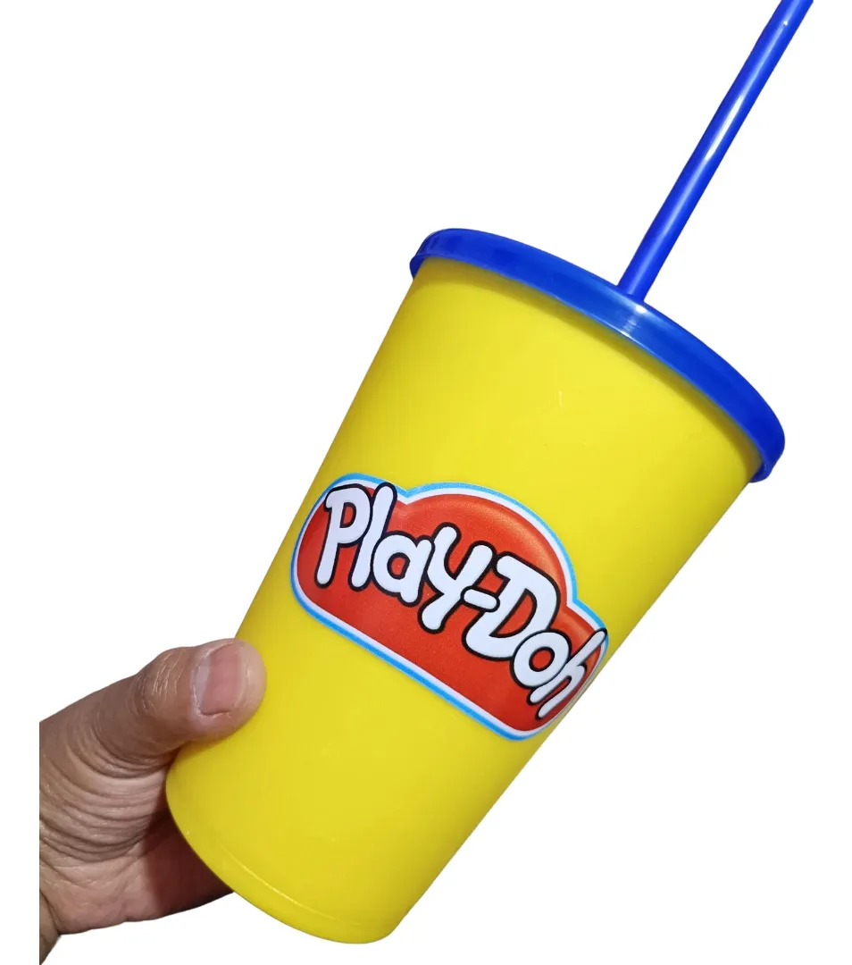 Fabricado en plástico resistente libre de BPA, este vaso tiene un diseño moderno inspirado en los envases Play-Doh, con tapa hermética y cuerpo ancho ideal para bebidas frías o calientes.